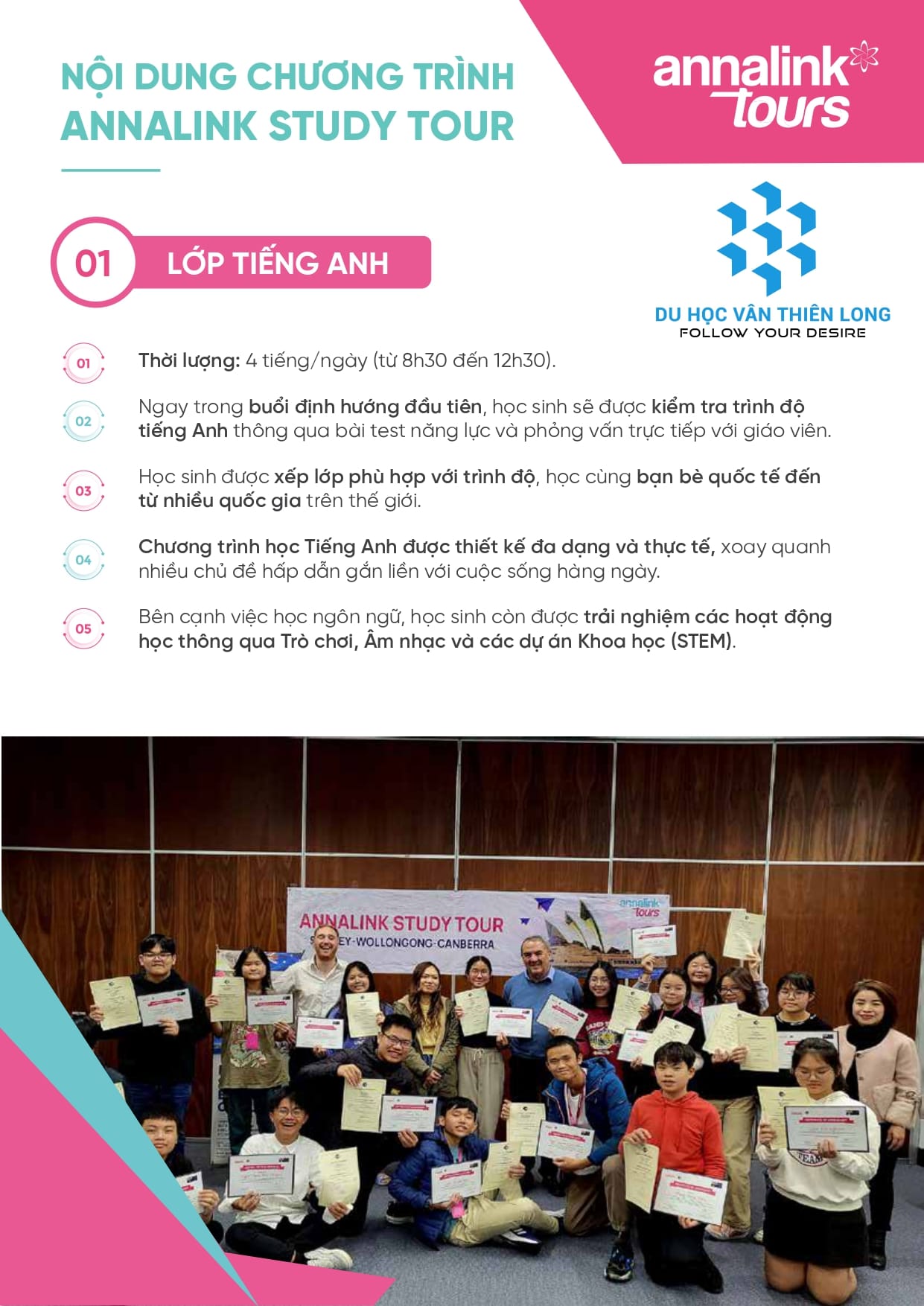 Vân Thiên Long vinh dự trở thành đối tác tuyển sinh chương trình du học hè của Annalink, đồng thời cung cấp dịch vụ tư vấn du học, hỗ trợ hồ sơ – visa, hướng dẫn chuẩn bị trước chuyến đi và đồng hành cùng học sinh – phụ huynh trong suốt quá trình tham gia chương trình, nhằm mang đến trải nghiệm an toàn, trọn vẹn và hiệu quả nhất.