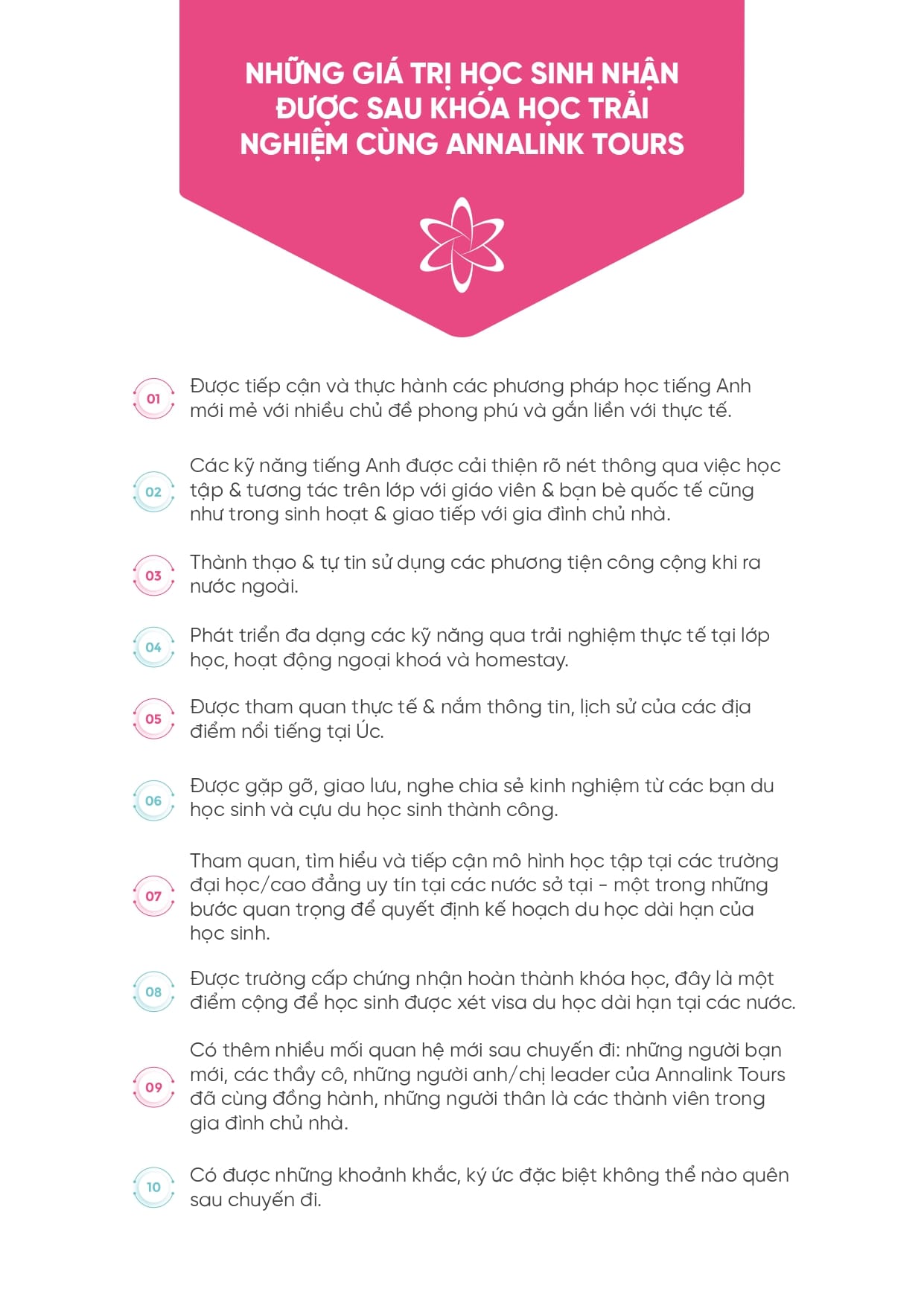 Annalink Tours thuộc Annalink OSHCstudents, một doanh nghiệp Úc chuyên cung cấp các dịch vụ dành cho du học sinh trên phạm vi toàn cầu. Annalink là đơn vị tư vấn giáo dục với hơn 15 năm kinh nghiệm, mỗi năm đã đưa hơn 500 học sinh tham gia các chương trình du học hè và xuân tại Sydney và Melbourne. Với phương châm lấy chữ Tâm làm nền tảng, Annalink không chỉ tổ chức các chuyến Study Tour mà còn kiến tạo những hành trình trải nghiệm và học tập khác biệt cho học sinh.